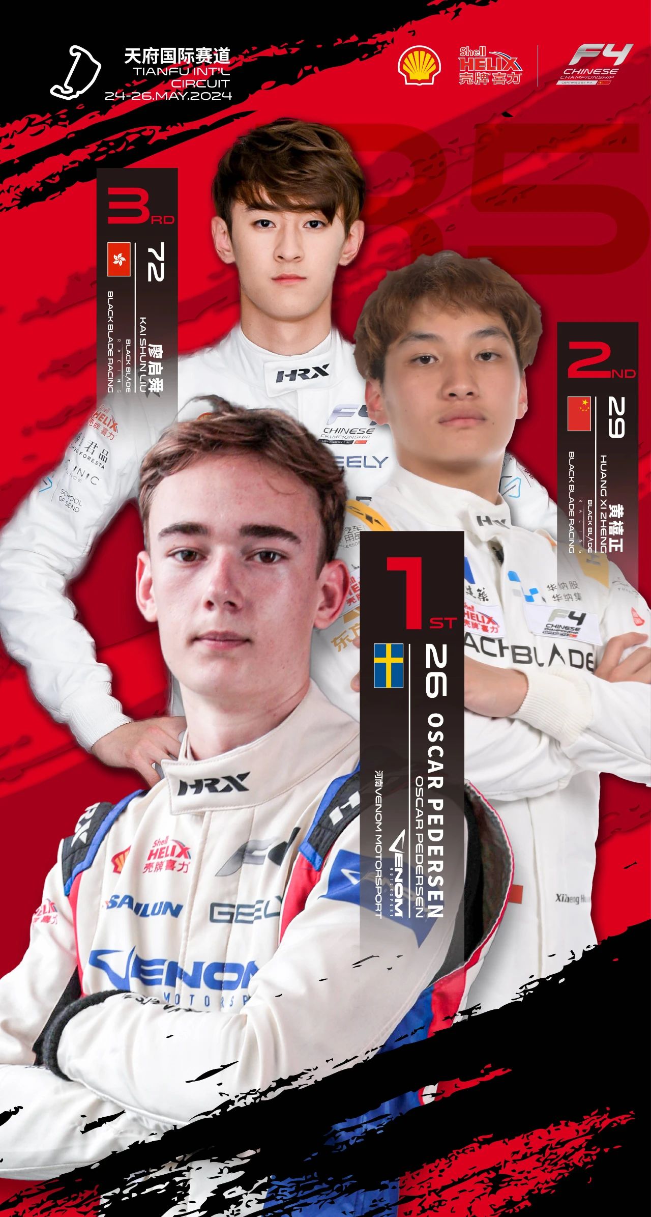 5月26日,2024壳牌喜力国际汽联F4方程式中国锦标赛在成都天府国际赛道举办成都站第五回合和第六回合决赛。河南Venom Motorsport车手Oscar Pedersen在第五回合决赛再下一城,Black Blade Racing廖启舜在第六回合获赛季首胜。
